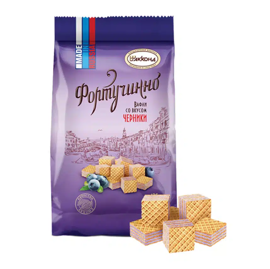ویفر پذیرایی روسی فورتوچینو با طعم بلوبریبسته بندی 125 گرمیFORTUCHINNO with blueberry flavor